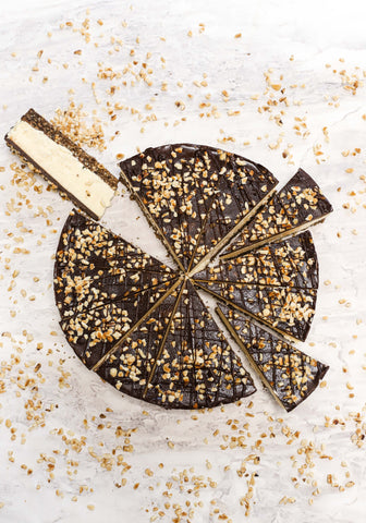 Our decadent hazelnut cheesecake - A layer of hazelnut cream cheesecake covered in a milk chocolate hazelnut spread, then with nibbed hazelnuts and finished off with a dark chocolate drizzle. All sat upon our signature crunchy chocolate biscuit base.