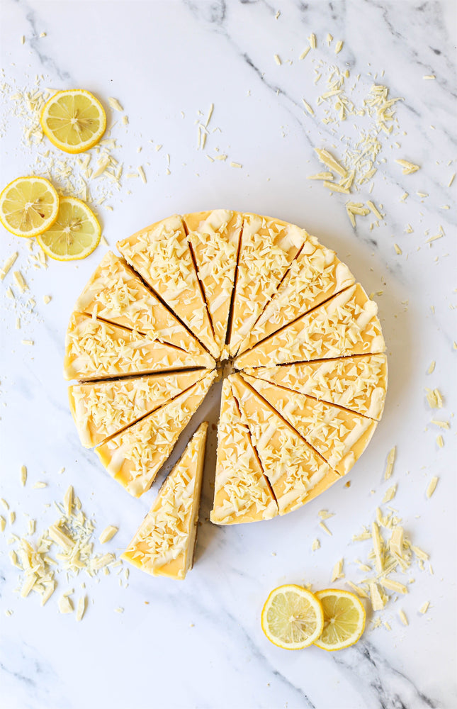 Lemon Cheesecake made with lashings of mascarpone topped with a sharp lemon curd finished with a white chocolate fudge sauce and scattered with white chocolate curls. All on top of our signature crunchy biscuit base.